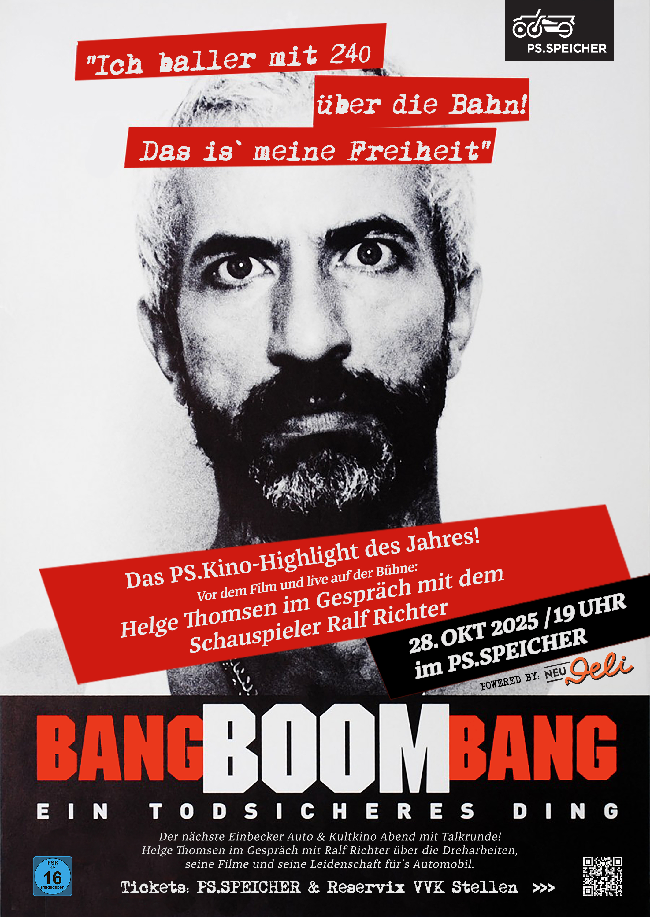 Als Stargast ist Schauspieler Ralf Richter dabei, der im Film den legendären Kleinkriminellen „Kalle Grabowski“ verkörpert. Zu Beginn der Vorführung spricht er im Dialog mit PS.SPEICHER-Berater Helge Thomsen über die Entstehung des Films, spannende Anekdoten vom Set und über die deutsche Filmszene. Die beiden klären zudem, welche überraschenden Verbindungen zwischen „Bang Boom Bang“ und dem PS.SPEICHER bestehen.